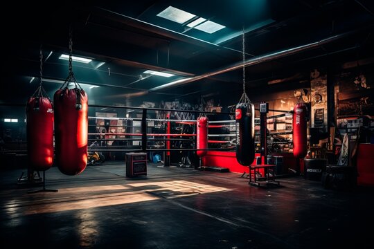 Athletic woman punching punch bag, cinematic shot through rope of boxing ring. Fitness and self-defense class for women, slender and frail lady training endurance and power, back view, female fighter