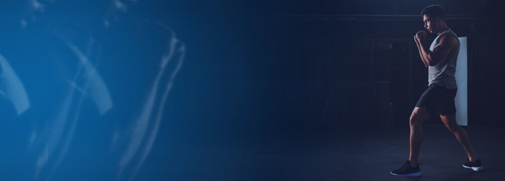 Exercise, mockup and man in gym for boxing workout, commitment and training on banner. Info space, fitness and strong athlete in fighting power challenge, boxer motivation and double exposure poster.