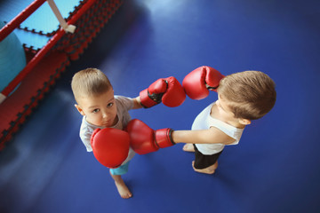 Focused adolescent guy wearing boxing gloves working out with male coach during self-defense course, practicing punches on mitts..