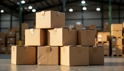 Stacked cardboard boxes under warehouse lights for Boxing Day, modern style