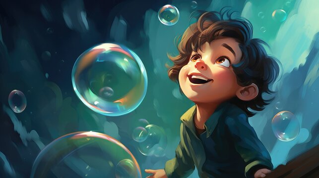 Cartoon little boy playing with bubbles, AI generated Image