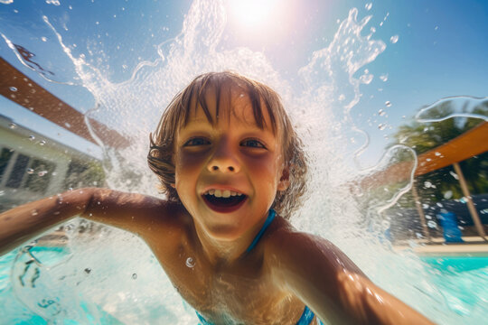 Generative AI illustration closeup of positive adorable little boy with wet hair swimming in pool with splashing water in daylight