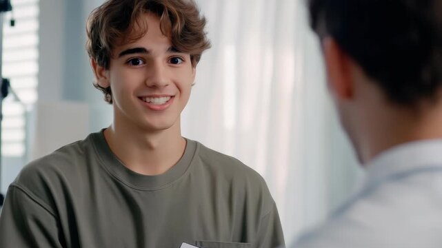 A young man with a smile on his face in a hospital waiting area, being greeted by a doctor.