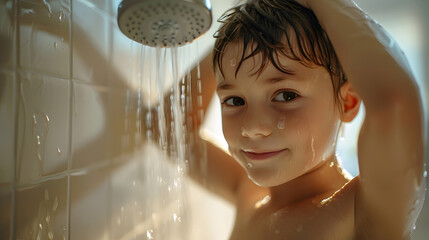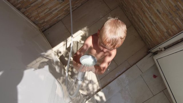 Happy young boy wash in shower