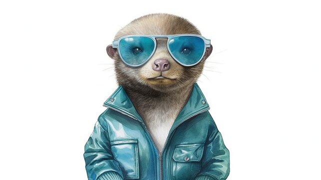 a drawing of a ferret wearing sunglasses and a leather jacket with a blue jacket on it's chest and a blue jacket on its chest.  generative ai