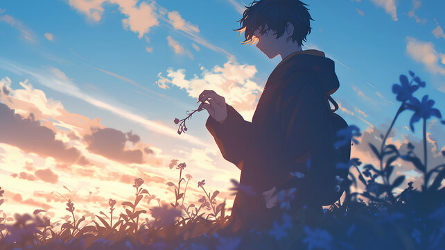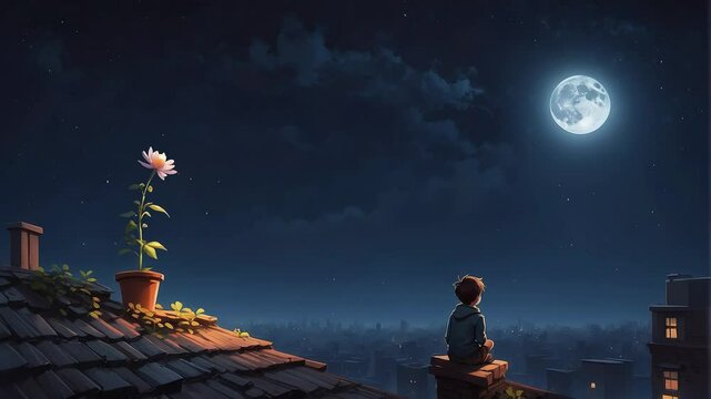 A lone flower stands tall on the rooftop, its petals reaching towards the moon in the dark night sky, while a boy sits peacefully beside it.