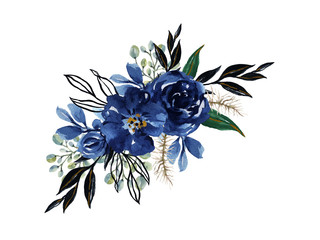 Watercolor elegant vintage navy indigo blue flower bouquet and leaves foliage hand painted