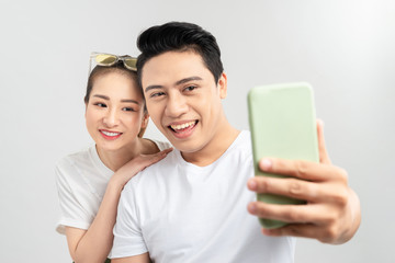 Beautiful young couple making selfie on smartphone