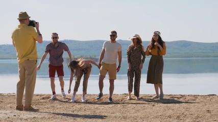 Young man taking picture of group of happy jumping friends when enjoying summer time at the beach