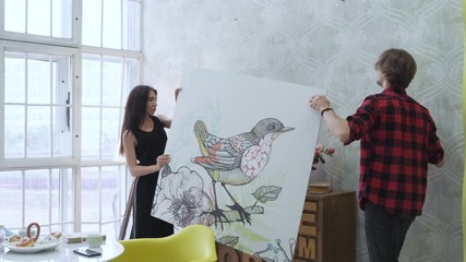 Happy couple hanging picture on the wall at home. A Young Couple In Their Bright Apartment Hang A New Picture On The Wall