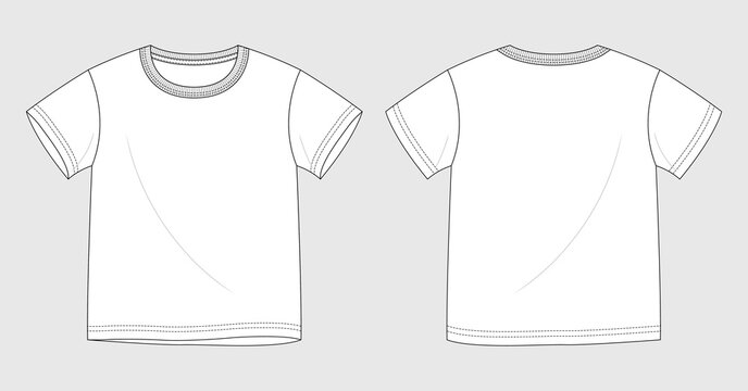 Vector editable CAD technical drawing fashion sketch white short sleeve crew neck t-shirt with neck rib and back neck binding - front and back view template for design.