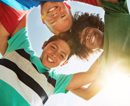Happy, low angle and portrait of children in sunshine for friendship, playing and fun together. Diversity, youth and boys huddle in circle for childhood, game and smile at school, camp and playground