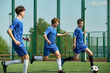 Group of teenage boys playing soccer on outdoor field, running and kicking ball during active game, showing teamwork and athletic movement in bright daylight