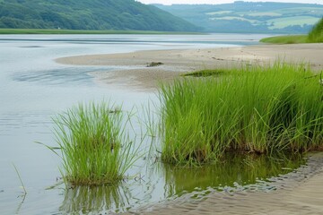 coastal salt marsh landscape illustration tidal flora, ecosystem habitat, brackish mudflat coastal salt marsh landscape