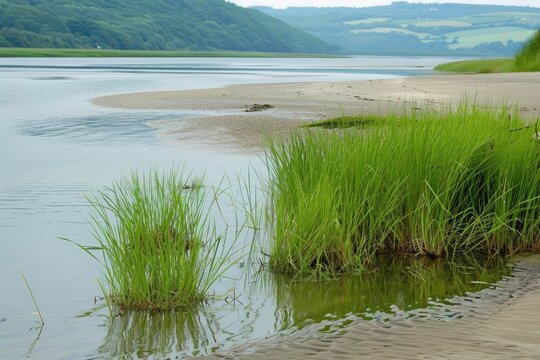 Summer Landscape with Reed Grass in Brackish Water of River Flowing into Ocean Bay