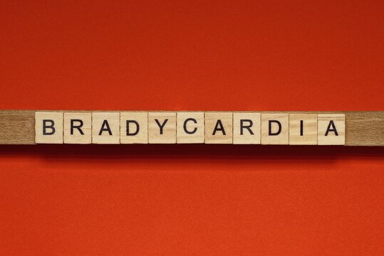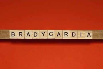 text the word bradycardia from gray wooden small letters with black font on an red table