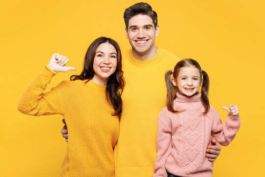 Young happy cool parents mom dad with child kid girl 7-8 years old wear pink knitted sweater casual clothes point thumb fingers on themselves isolated on plain yellow background. Family day concept.