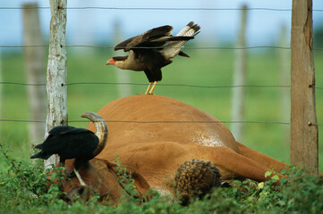 Crested caracara (Caracara plancus) atop a dead bull (Bos indicus); Pantanal, Brazil