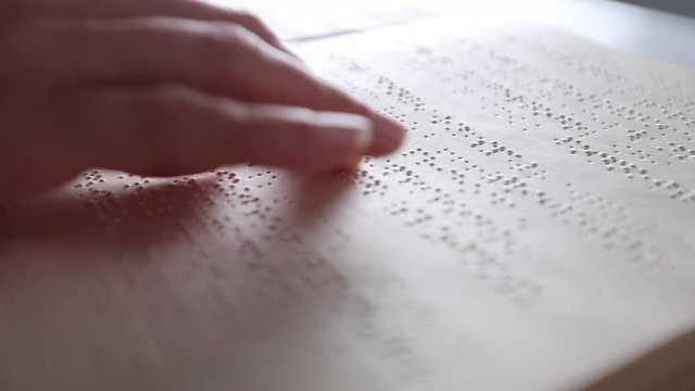 Hands of a blind person reading some braille text touching the relief. Horizontal