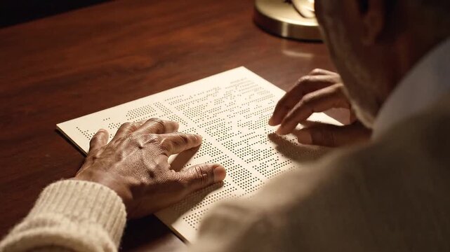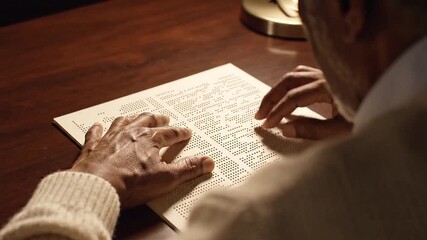 Hands of a Blind reading Braille. Close Up. The hand of a blind man reads the text of a braille book. Braille book