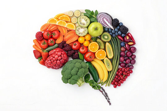 Artistic brain with pathways of diverse foods, food, holistic brain nutrition