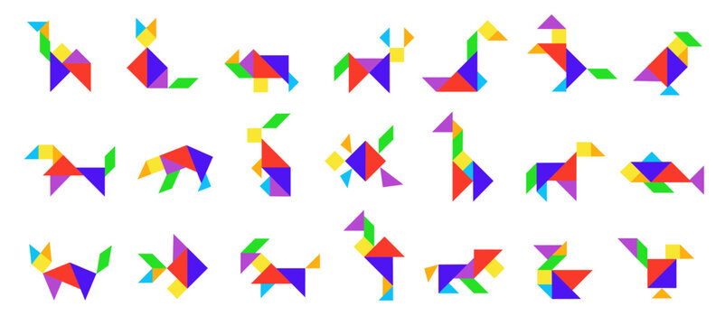 Tangram animals. Geometric traditional Chinese puzzle game with animal shapes, abstract geometry logic figures made of triangles squares parallelograms. Vector tangram set