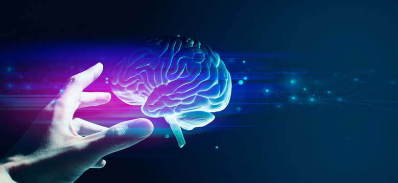 doctor hand holding a holographic of human brain in healthcare medical theme; a technology for science neuron cell network