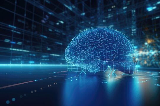 Technology wireframe, full image of the brain, side view, in the center of the image, floating and processing information. The background has a binary background of blue. Futuristic 3D
