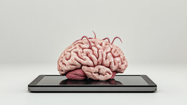 A decayed and rotten brain represented with worms, laying on a digital tablet, symbolizing mental fatigue and screen overuse