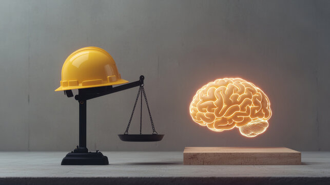 Hardhat Conceptual Thinking, Hard hat balancing scale opposite glowing brain symbolizes balance between safety