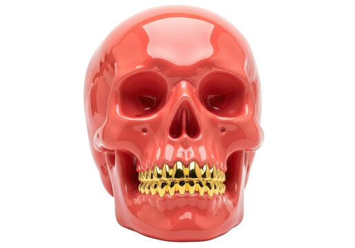 Red skull with gold teeth isolated PNG, glossy human cranium with golden dental implants on transparent background, Halloween