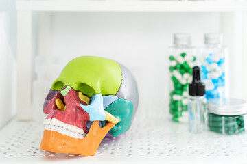 Plastic and glass bottles on shelf above bright cranium on table in lab on white background