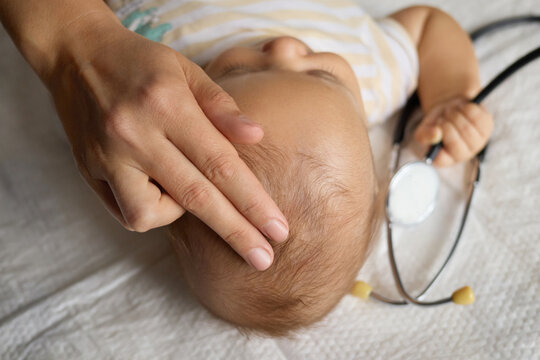 Unrecognizable pediatrician examining infant's head by gently touching the cranial bones to assess development and health during routine hospital visit