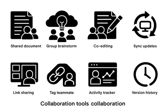 Set of black and white collaboration tools icons for teamwork and co-editing in outline style