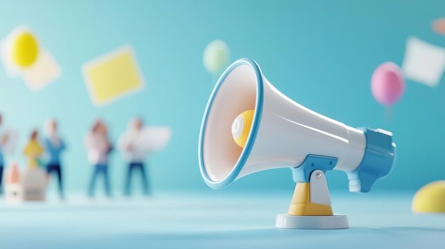 A creative 3D scene of a megaphone integrated into a brainstorming session, depicting diverse team members collaborating on campaign strategies and messaging