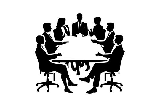 Silhouette illustration of five people sitting around a table in a meeting or conference setting