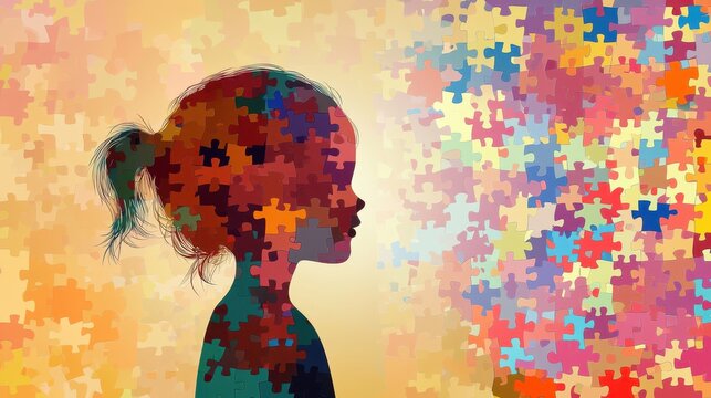 child silhouette made of colorful puzzle pieces on puzzle background, copy space