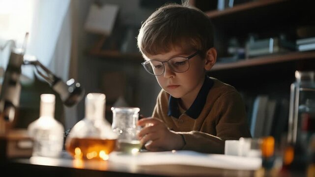 Young boy in lab setting, focused on scientific experiment with microscope and beakers.