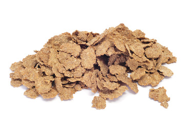 Pile of bran flakes on white background, top view. Healthy breakfast cereal