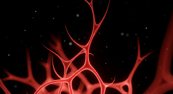 Microscopic view of vibrant red and blue cells with numerous branching tendrils, set against a dark blue background