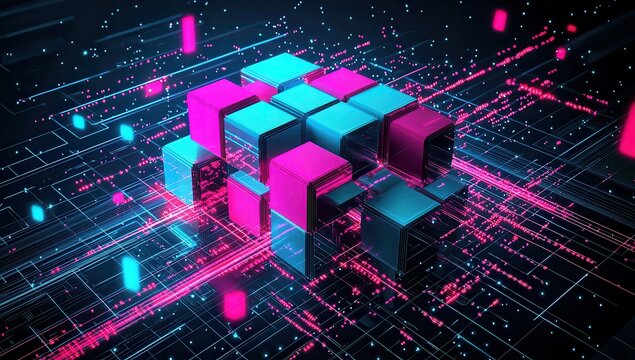 Vibrant magenta and blue blocks assembling into a sleek futuristic structure