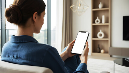 Hand holding mobile smartphone with blank white screen mockup while sitting in a modern living room interior background for app design website display copy space branding marketing