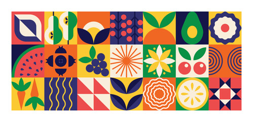 Geometric food pattern. Abstract minimal floral banner, natural organic fruit plant simple shapes. Vector illustration