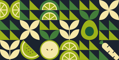 Green geometric mosaic seamless pattern illustration. Organic fruit vegetable geometric pattern. Natural food background creative simple bauhaus style, agriculture vector design. Healthy Food pattern