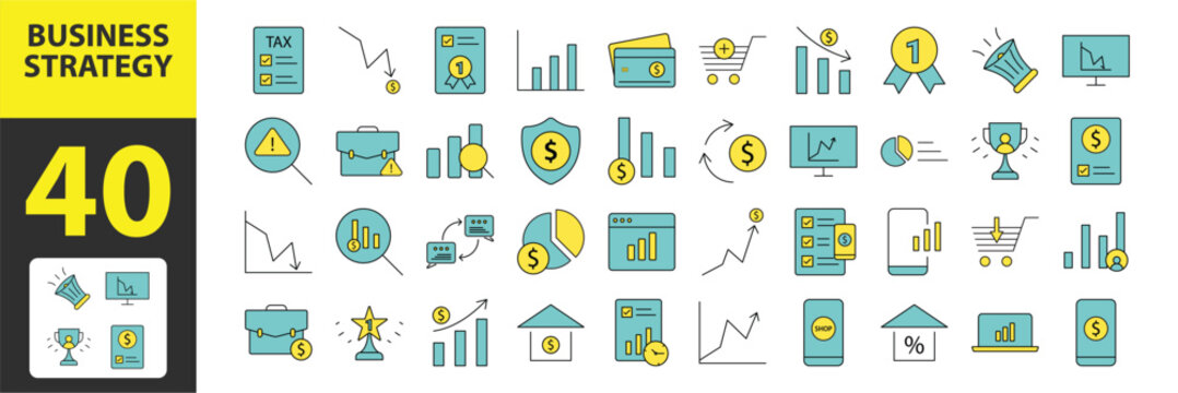 Strategic Mastery in Business: Vibrant Icon Collection for Filled Flat Solutions, Brand Brilliance, Competitive Edge, Goal Planning, Competitor Insight, and Consolidation – Fully Editable!