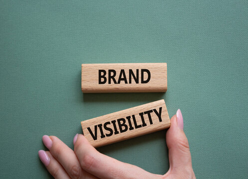 Brand visibility symbol. Wooden blocks with words Brand visibility. Beautiful grey green background. Businessman hand. Business and Brand visibility concept. Copy space.