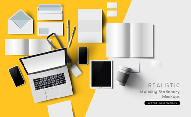 Corporate identity premium branding design. Stationery mockup vector megapack set. Template for business or finance company. Folder and A4 letter, visiting card and envelope based on modern gold logo.
