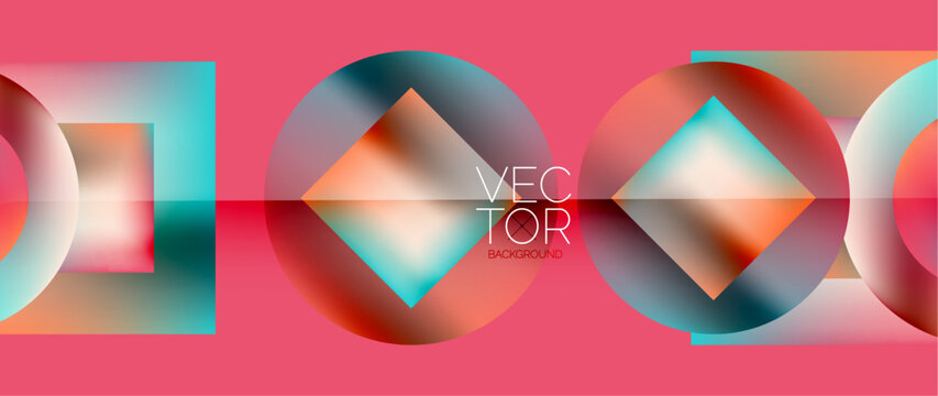 Squares and circles design. Fluid color gradients with metallic effects. Serene synergy of shapes, merging squares and circles into harmonious, captivating design