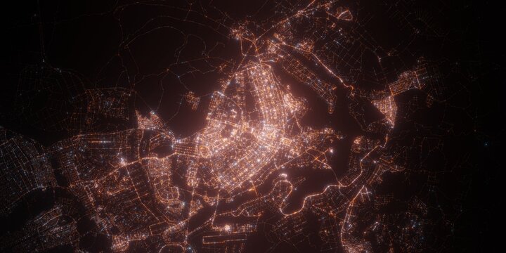 Brasilia (Brazil) night view with street lights. Aerial shot from space. top view heading north,