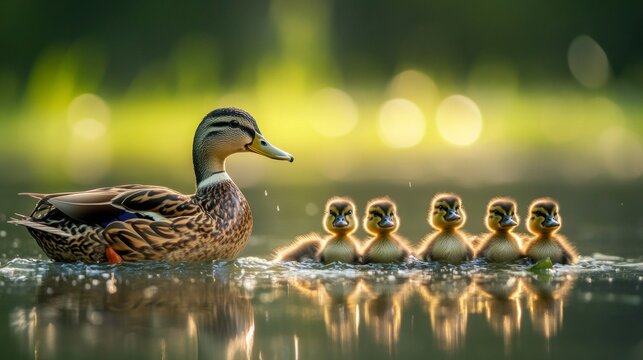 Mama Duck Leading Adorable Ducklings Through Pond